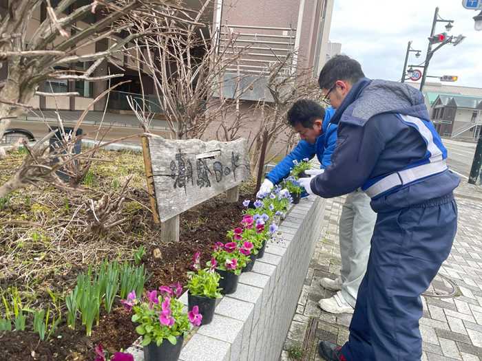 当日は地域のみなさんと一緒に、割り当てられた花壇へ色とりどりの花を植え、町全体が一気に春らしい雰囲気に包まれた。