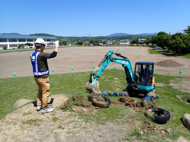 作業には、室蘭開発建設部発注「一般国道236号浦河町西舎交差点改良外一連工事」の地域貢献活動として従業員8名がバックホウやタイヤショベルにより古タイヤの撤去・交換を行った。